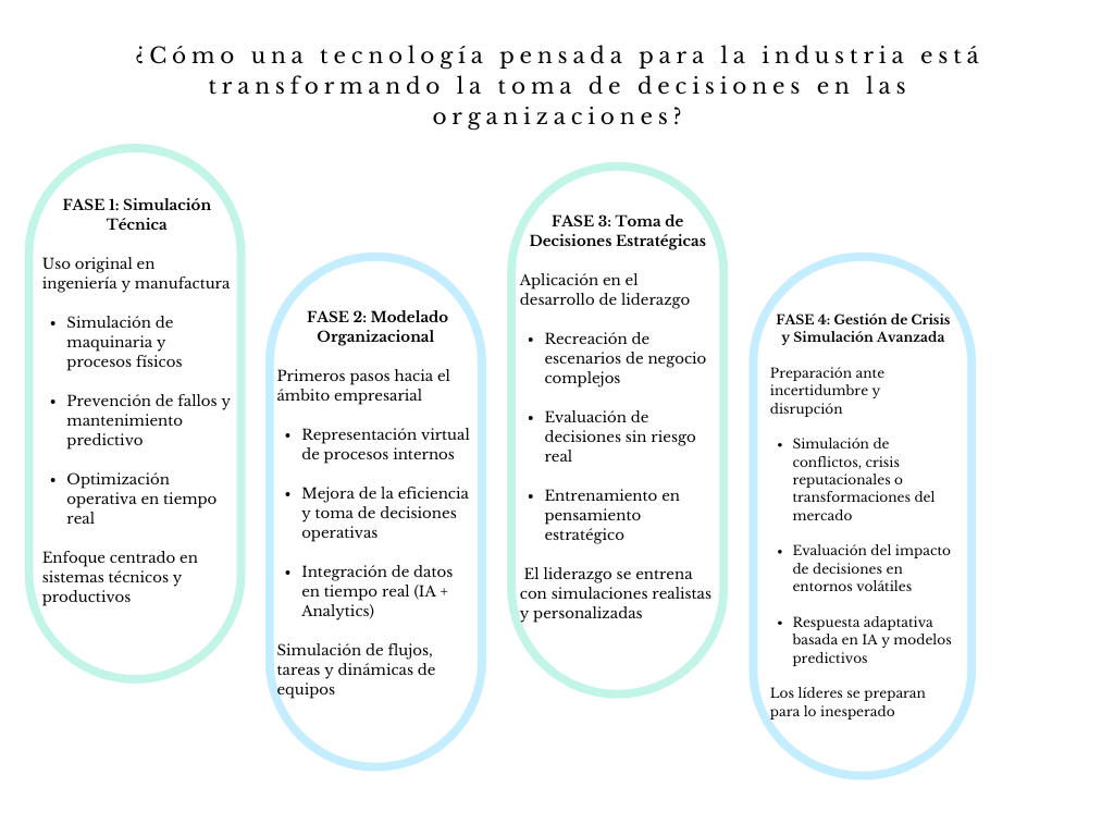Este mismo impulso que está transformando el sector salud puede ofrecer valiosas lecciones para otros ámbitos, como el desarrollo del liderazgo en las organizaciones. A medida que las tecnologías de gemelos digitales se perfeccionan en la simulación de procesos y sistemas de salud, es posible proyectar aplicaciones similares para la simulación de escenarios de toma de decisiones empresariales. Al igual que en la medicina, los gemelos digitales pueden ayudar a los líderes empresariales a experimentar, aprender y tomar decisiones críticas sin poner en riesgo los recursos reales.