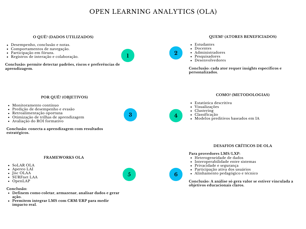 OLA é um marco que permite extrair valor educativo de dados diversos, desde LMS e MOOCs até ambientes informais e abertos. Proporciona a base para modelos preditivos transferíveis e escaláveis, permitindo personalizar rotas de aprendizado e antecipar necessidades formativas de maneira estratégica.