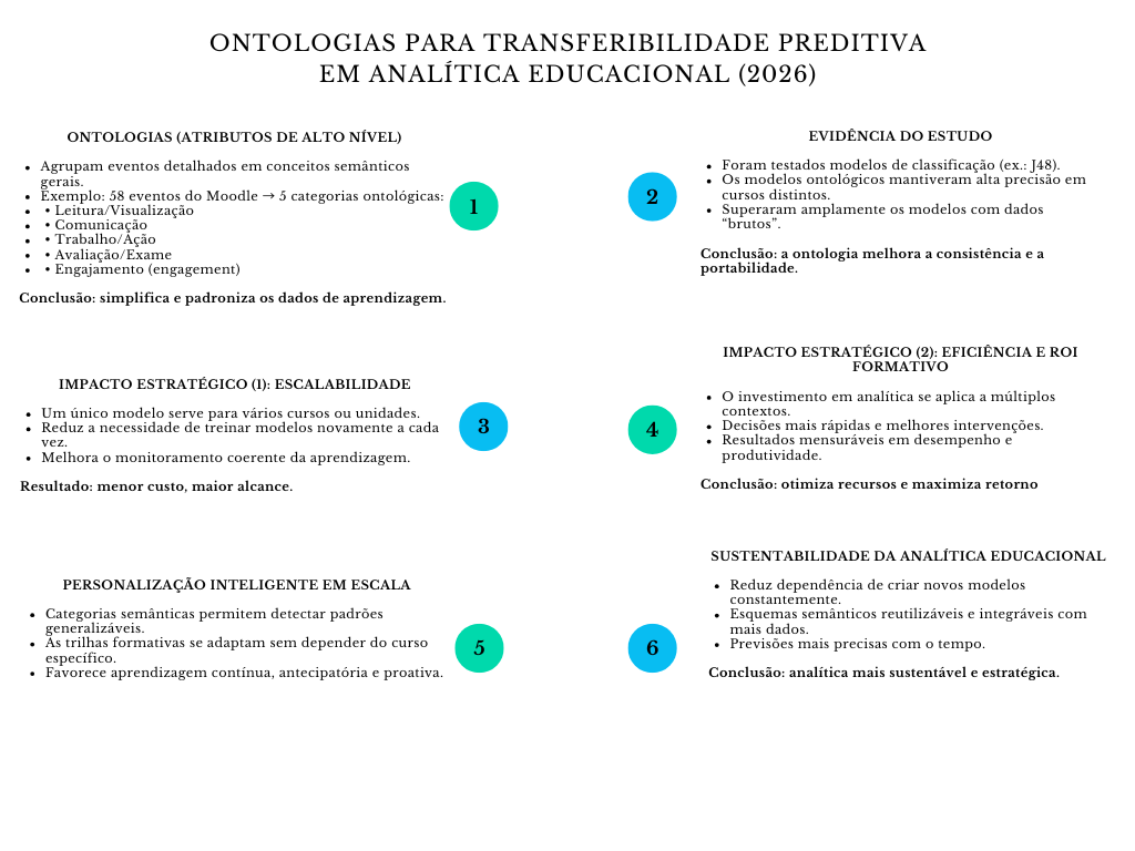As ontologias facilitam a transferibilidade dos modelos preditivos, permitindo que os algoritmos se apliquem em distintos cursos e contextos sem perder precisão. Isto melhora a escalabilidade, reduz custos de manutenção e fortalece a medição do ROI formativo.