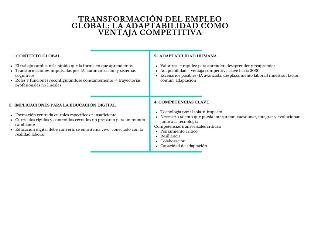 La adaptabilidad es la base de la empleabilidad sostenida. No garantiza un puesto específico, pero sí la capacidad de seguir siendo relevante, moverse entre roles y aprovechar nuevas oportunidades a lo largo de la carrera profesional. - ¿Qué pasa si la educación digital no evoluciona hacia este enfoque?