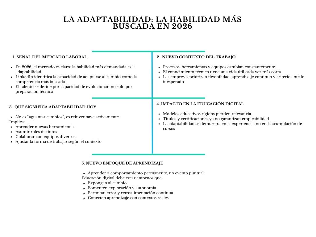 Se puede entrenar. La adaptabilidad se desarrolla practicando el aprendizaje continuo, enfrentando problemas reales, recibiendo retroalimentación oportuna y aprendiendo a reflexionar sobre la propia experiencia. No es un rasgo fijo de personalidad. - ¿Qué rol cumple la inteligencia artificial en la educación digital de 2026?