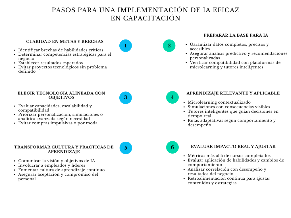 Diagrama pasos para una implementación de IA eficaz en capacitación