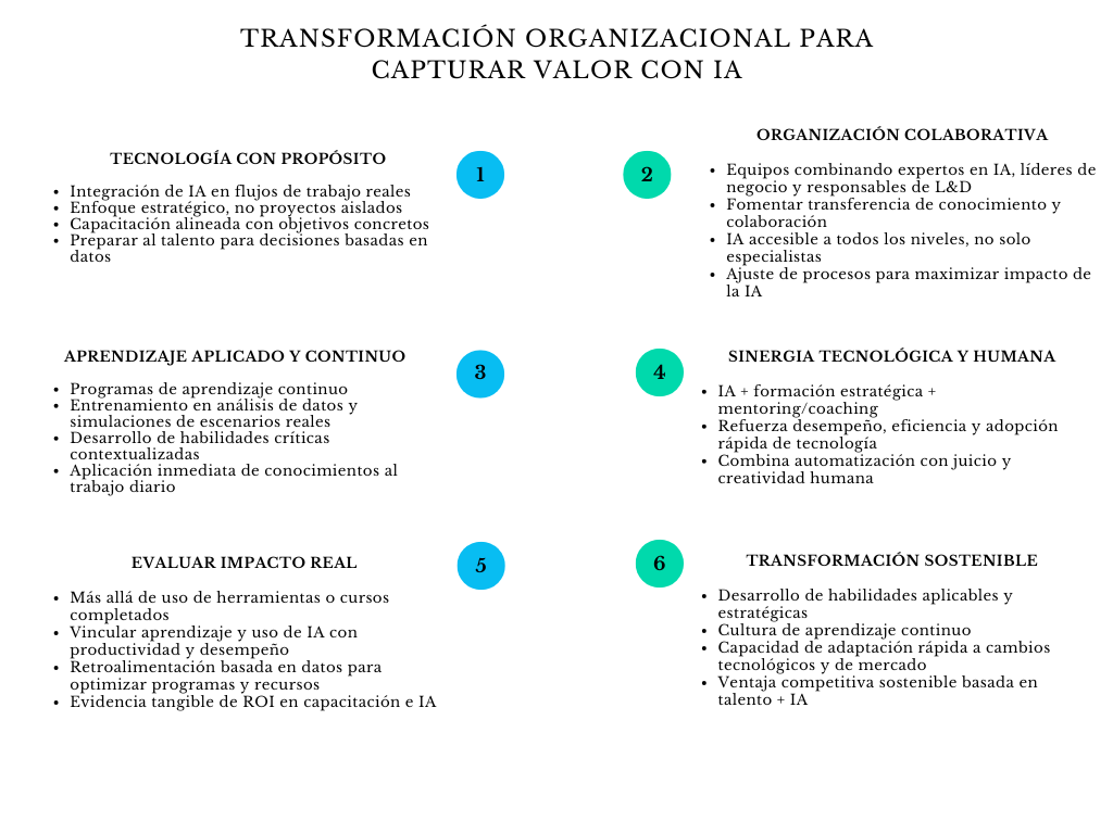 En conclusión, la experiencia de las organizaciones líderes muestra que capturar valor con IA requiere transformación integral, no solo tecnología. Esto tiene un efecto directo sobre la capacitación: el aprendizaje debe diseñarse en contexto, alinearse con la estrategia y los flujos de trabajo, y combinar tecnología con desarrollo humano. Las empresas que adoptan este enfoque logran no solo habilidades más aplicables, sino también una cultura de aprendizaje continuo y capacidad de adaptación, elementos esenciales para prosperar en un entorno empresarial impulsado por la inteligencia artificial.